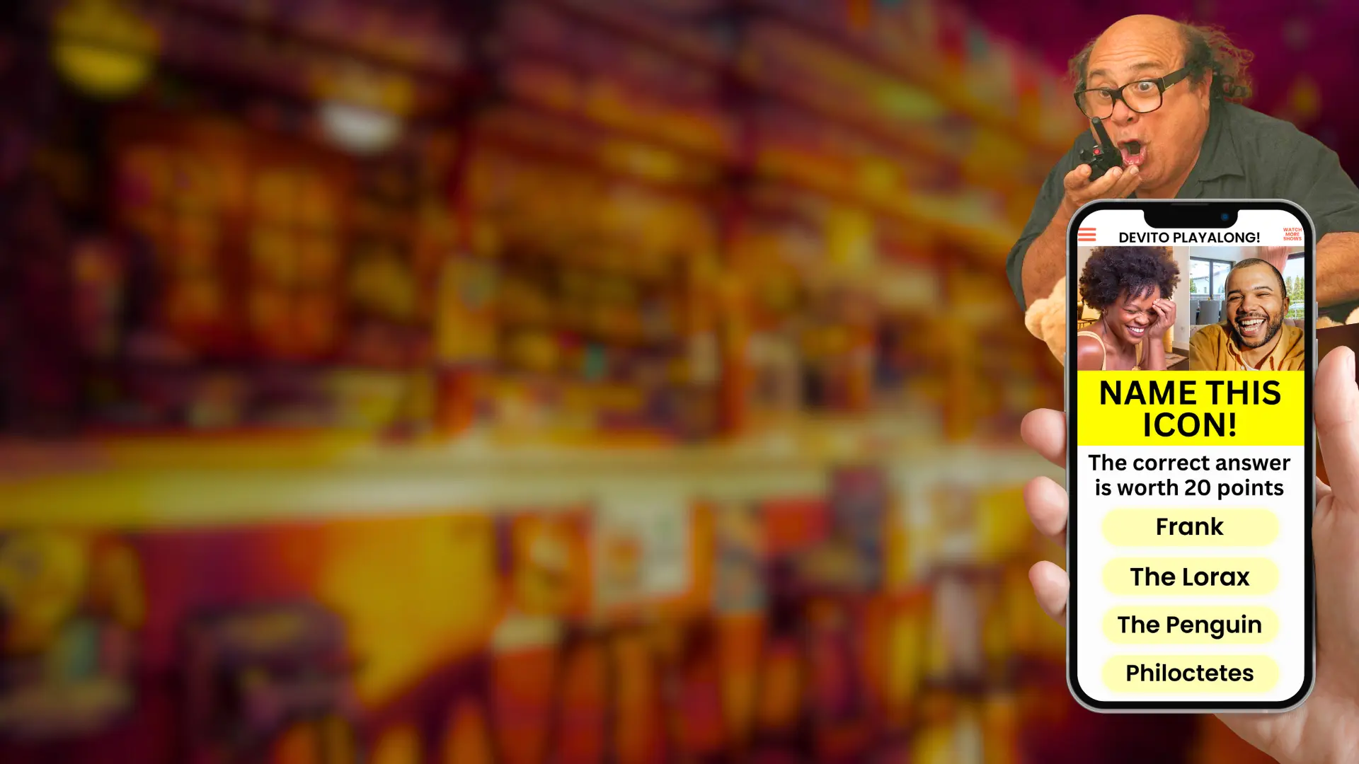 Get ready for the man-cheetah himself! Danny DeVito is the ultimate comic relief actor, playing iconic roles from The Penguin in Batman Returns (1992) to Harry Wormwood in Matilda (1996) to Frank in It's Always Sunny in Philadelphia. Why just watch the movies of this fun-time actor, when you could Play Along with them too? Play Danny DeVito movie trivia while you watch his best movies from his decades long career! Check out mini-games scene-synced to his stints as The Lorax in Dr. Seuss' The Lorax (2012), Ralph in Romancing the Stone (1984), and his cameo in Mars Attacks. Setup is super simple, so you can start laughing with this 4'10" actor in seconds. You can even relive DeVito's best moments with friends - you can play in-person with our Party Games, or virtually with online multiplayer. Anyway, I start blasting-