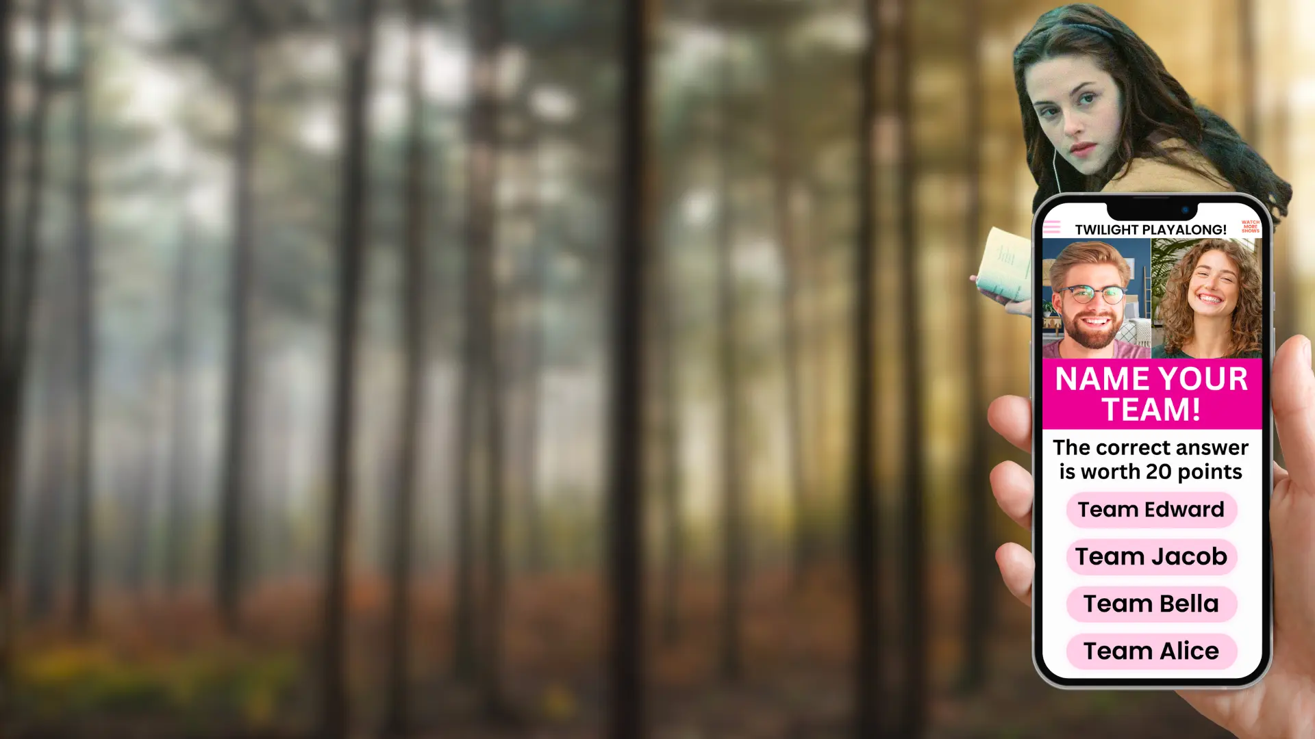 Forever begins again! With every Twilight movie back in theaters in October 2025, there's no better time to play minigames scene-synced to this iconic teen romance! Fall in love with our Twilight saga trivia while you watch Bella Swan fall for Edward Cullen, pine for Jacob Black, and fight a vampire army alongside Renesmee. Setup is incredibly simple, so you can start playing in seconds. Relive quotable lines and thrilling drama with friends by playing multiplayer, either in-person with our Party Games or virtually with our online video chat! Are you afraid?